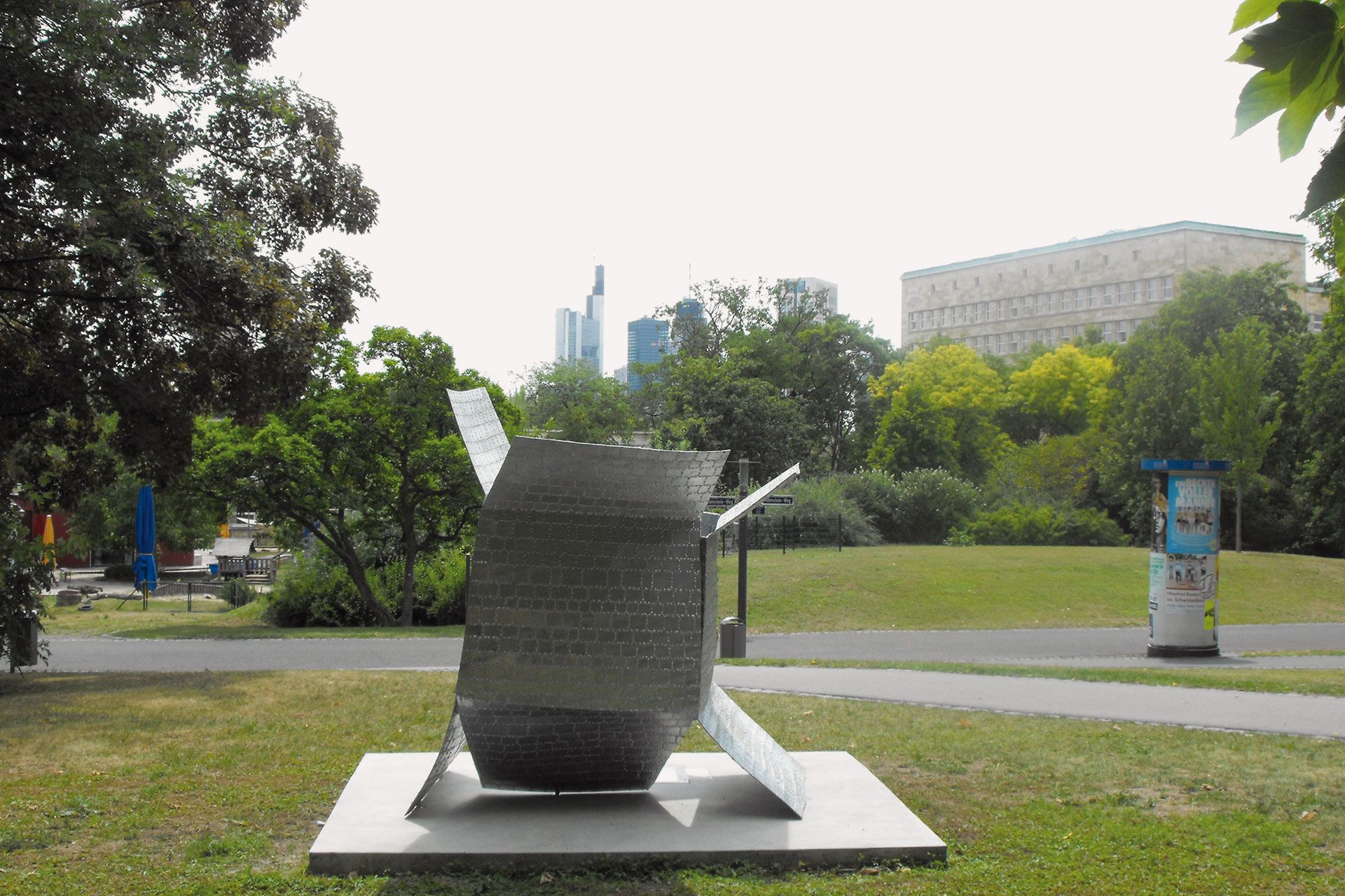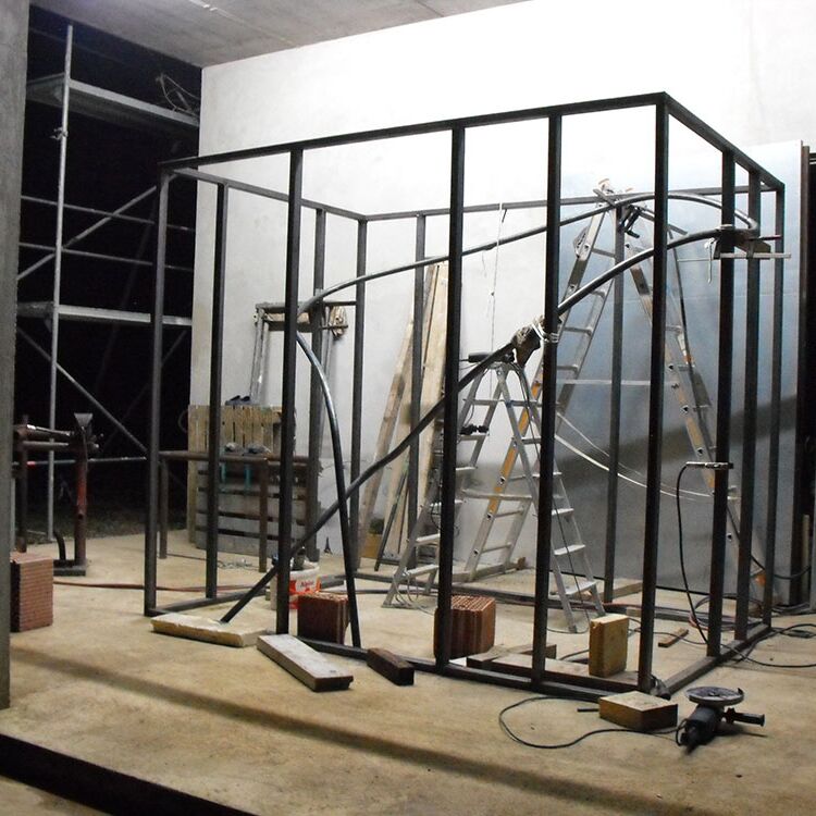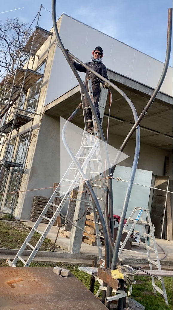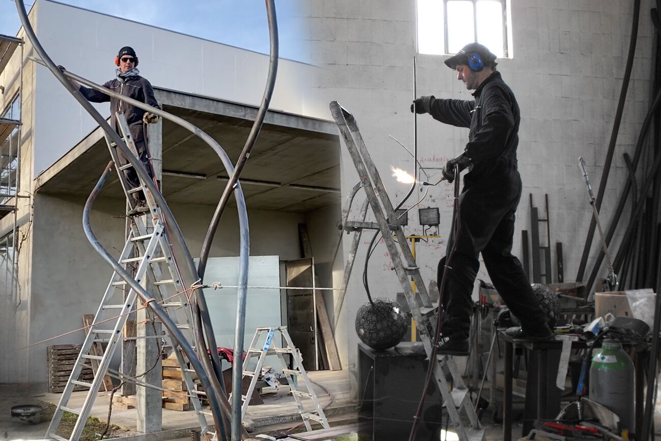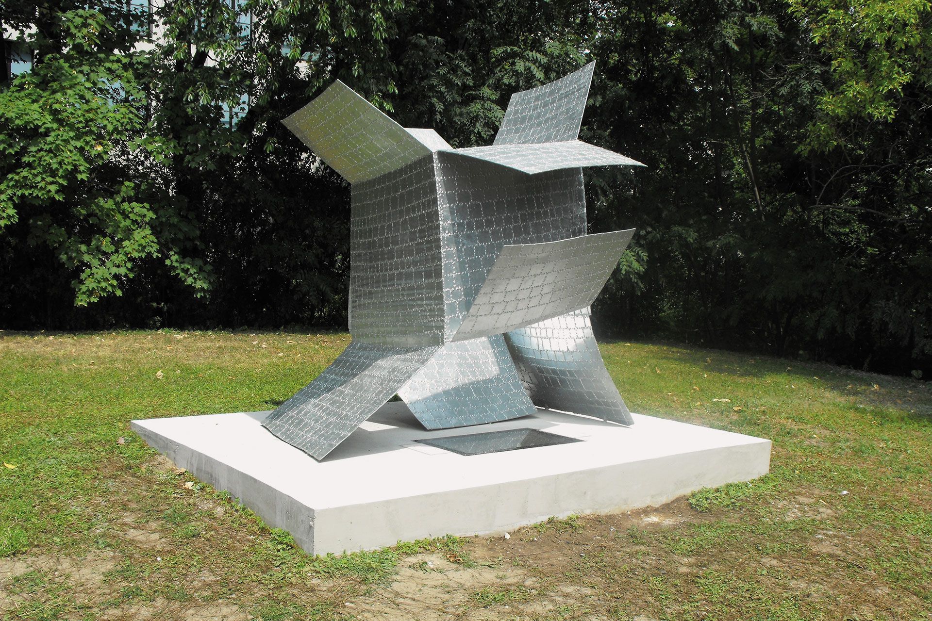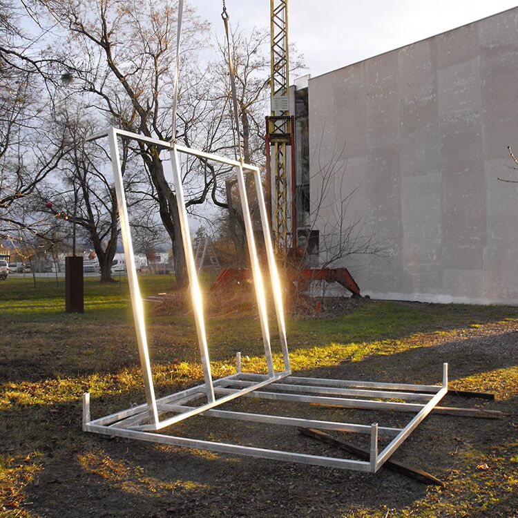 Die projektierte Skulptur ist in einer Größe von 200 x 300 x 250 cm aus verzinktem und farbigem Stahl geplant.