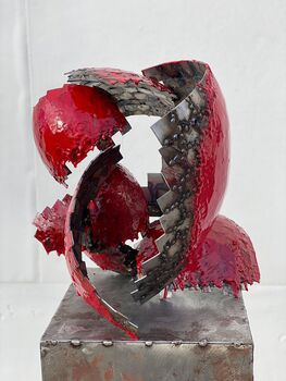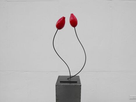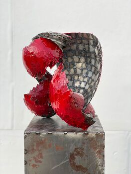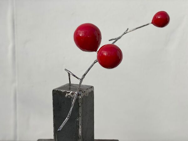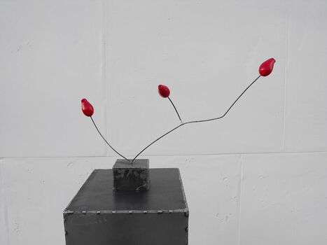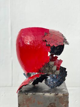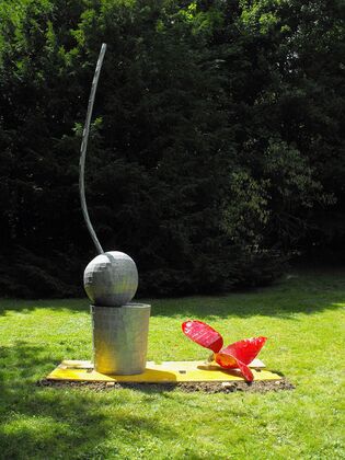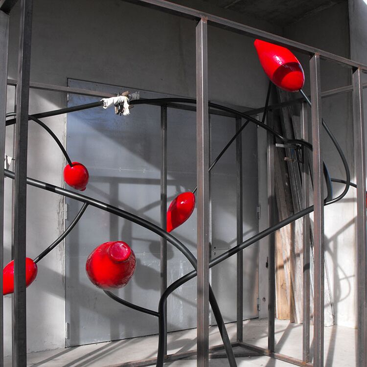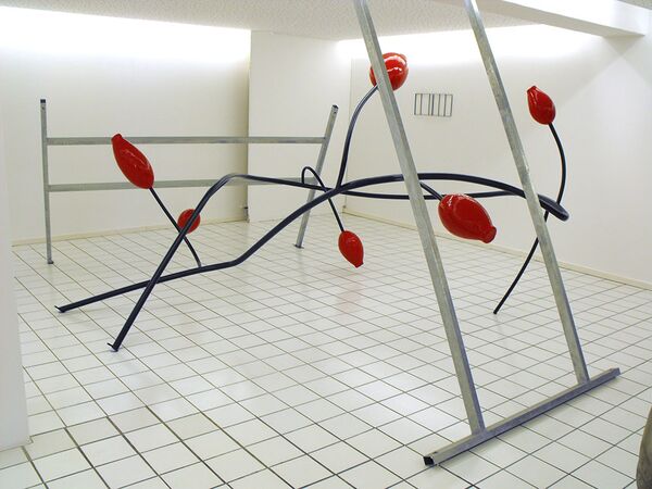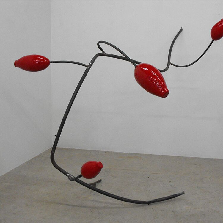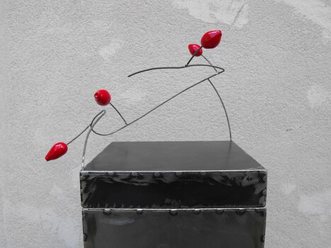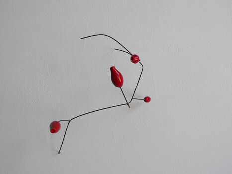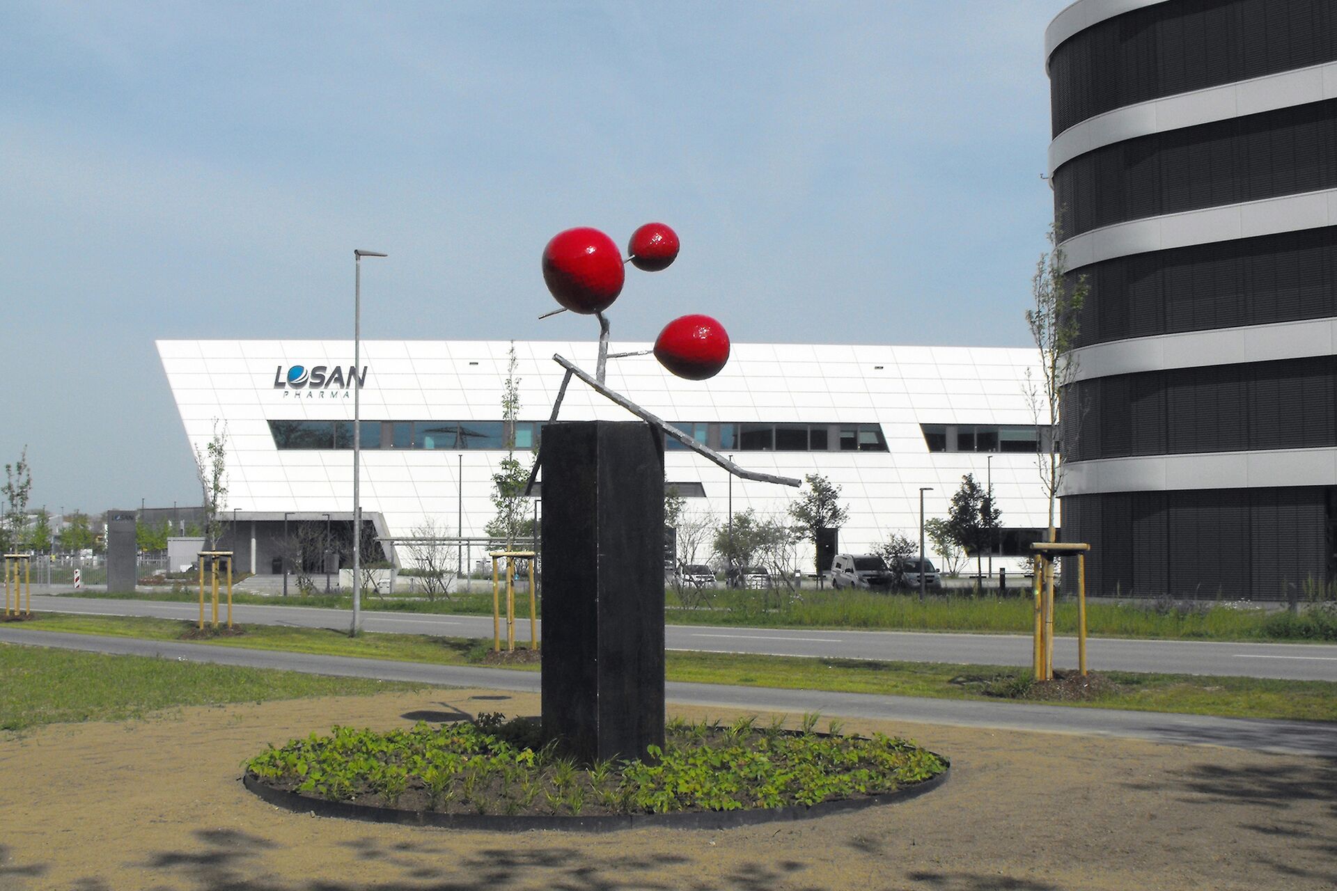 Die Skulptur, ein im Anschein fragiles Zusammenspiel aus stählernem Liniengefüge und roten rundlichen Körpern ruht wie zwischengelandet auf einem hohen massivem Stahlsockel.