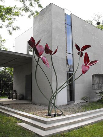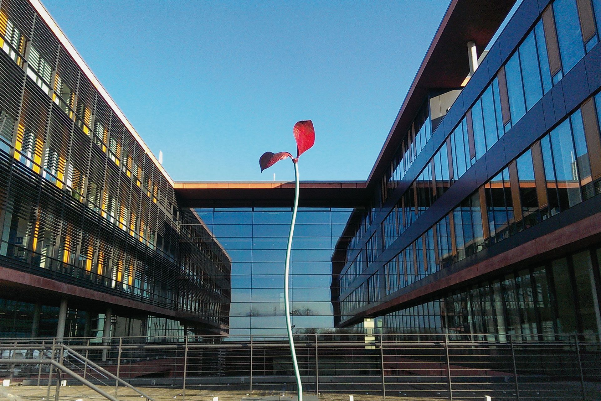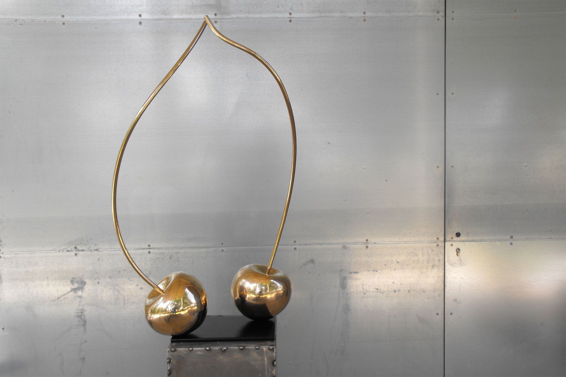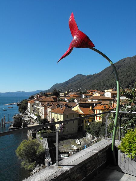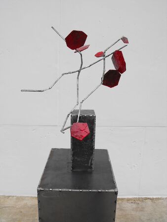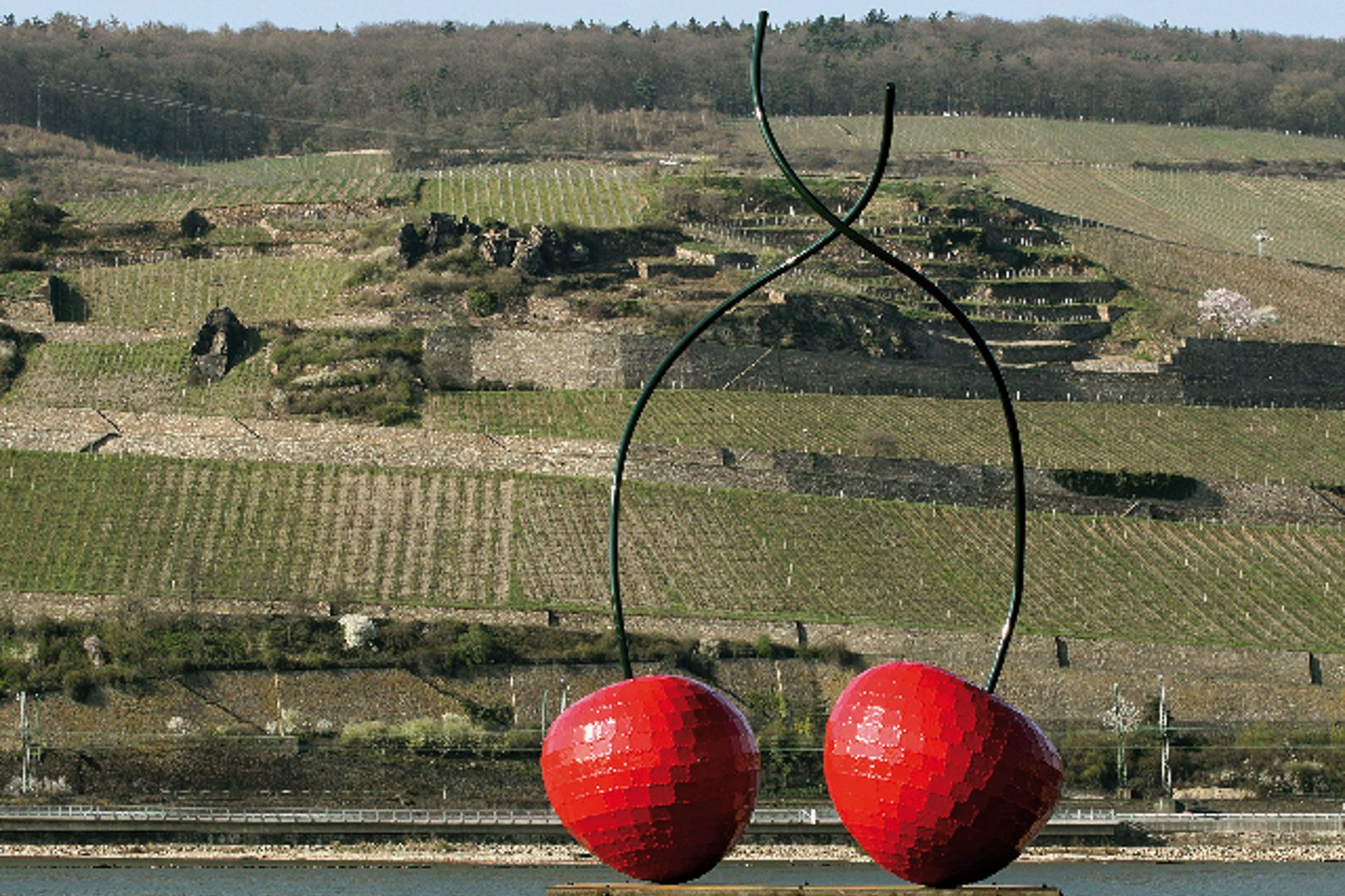 Die Skulptur, ein im Anschein fragiles Zusammenspiel aus stählernem Liniengefüge und roten rundlichen Körpern ruht wie zwischengelandet auf einem hohen massivem Stahlsockel.