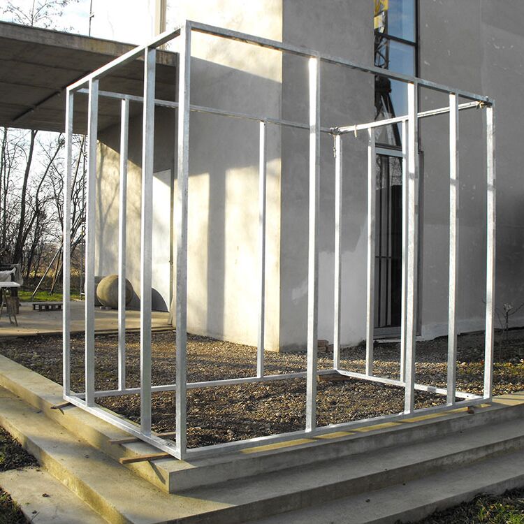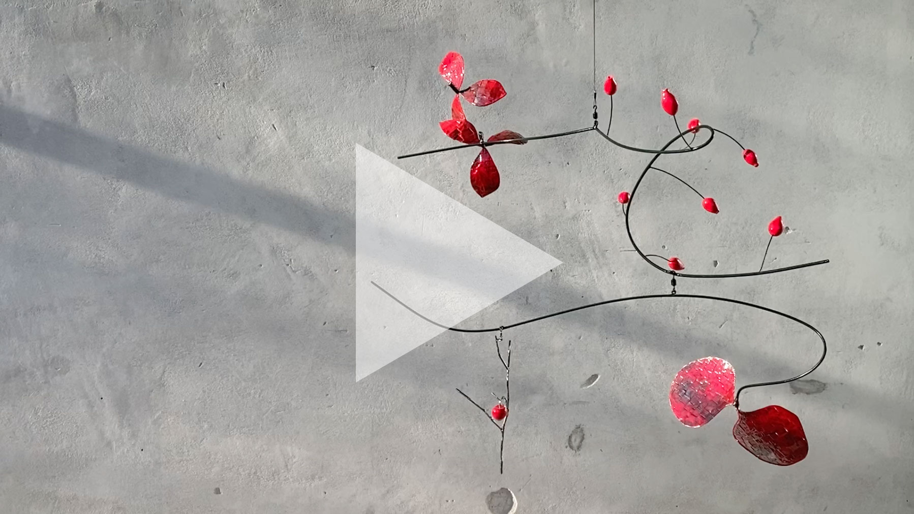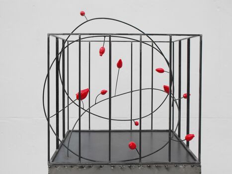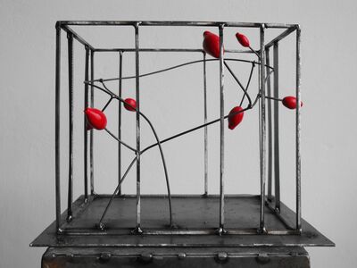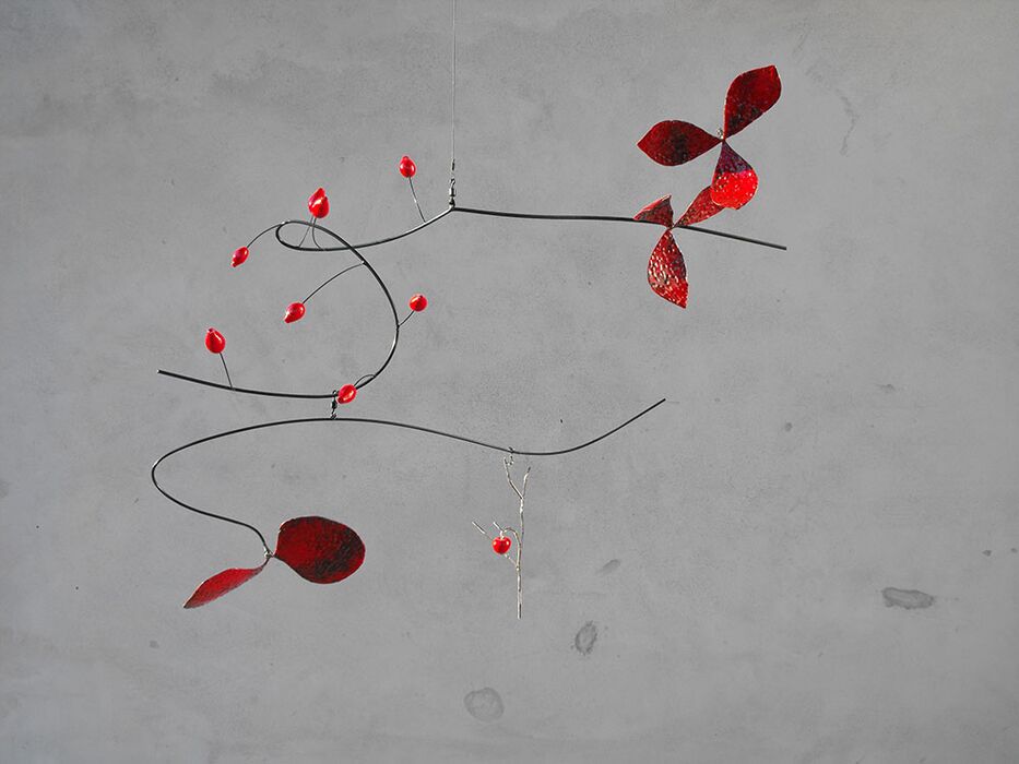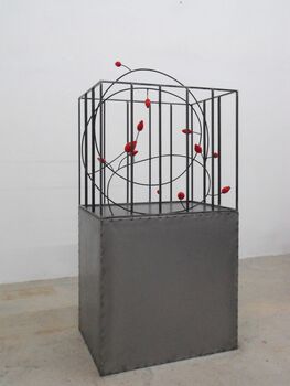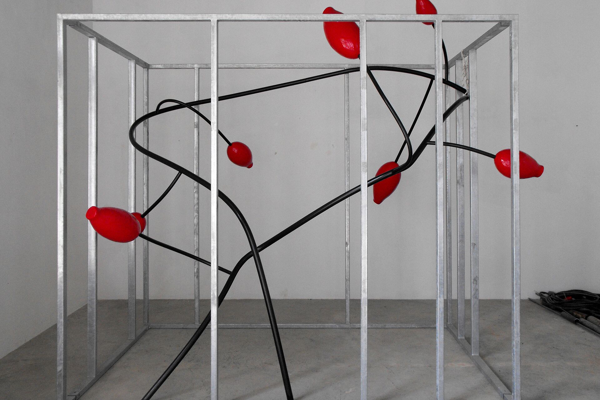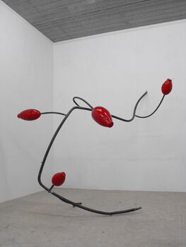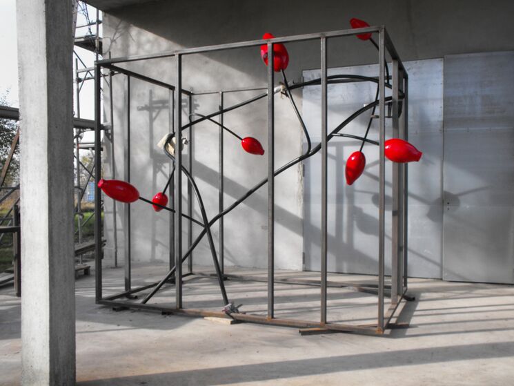 Ein Gitterraum in dem ein »Hagebutten«- Reigen kreist. Durch seine Größe ist die Skulptur ein kommunikativer, vom Betrachter betretbarer und erlebbarer Raum.